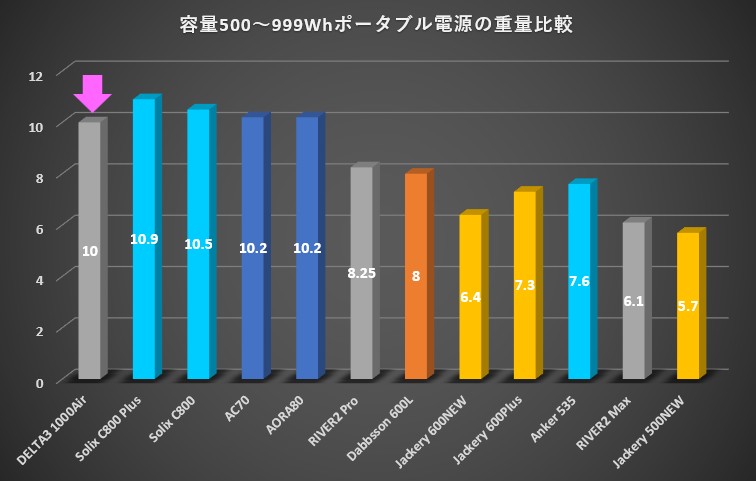 ① EcoFlow DELTA3 1000Airと容量容量500~999Wh以下ポータブル電源の「サイズ」比較