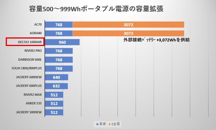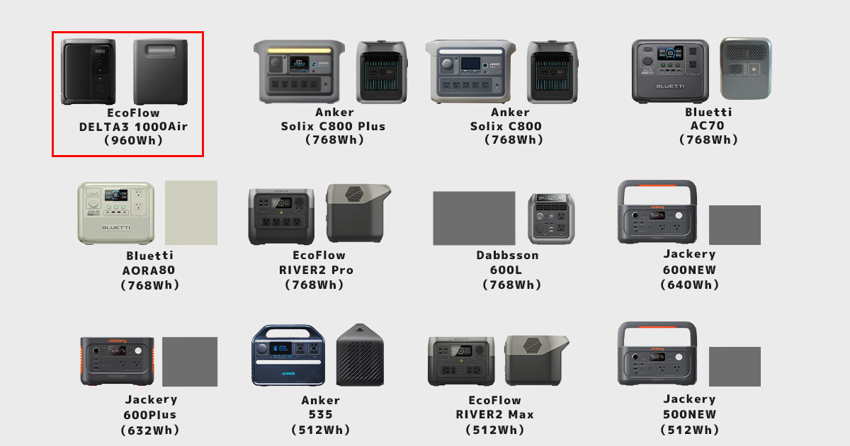 この記事では、容量960Whの EcoFlow DELTA3 1000Air を「500~999Whクラス」として比較しています。