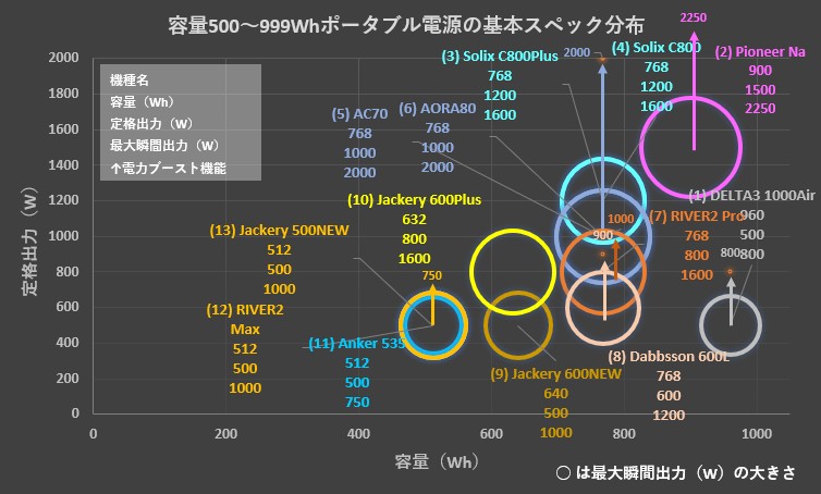 しかし、容量的には「1000Whクラス」とも言えるため、1000Whクラスのポータブル電源との比較表も併せて掲載しておきます。