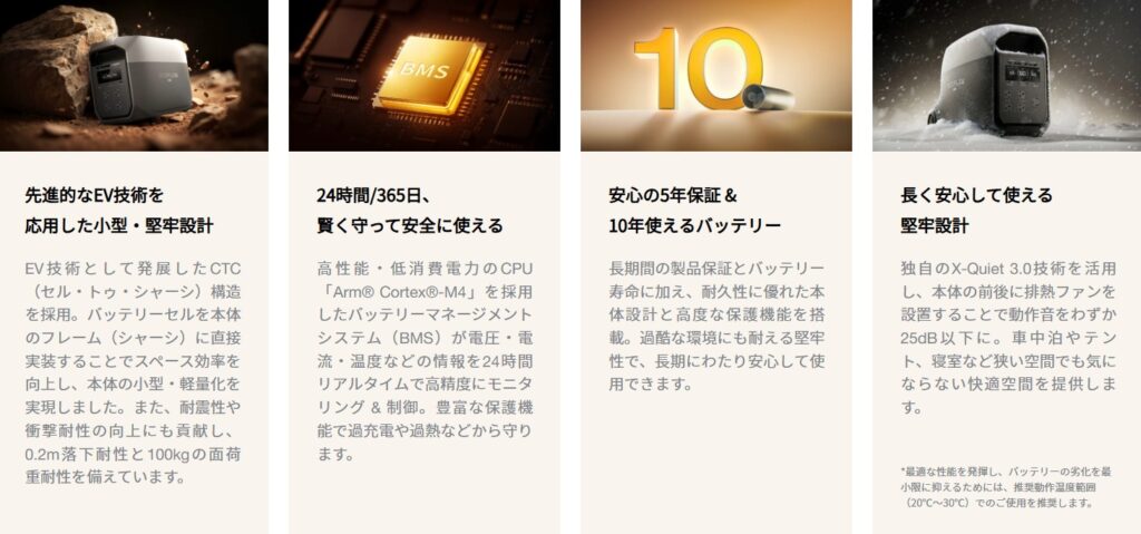 EcoFlow DELTA3 Ultra/DELTA3 Ultra Plusは、安全性や耐久性に優れた車載グレードのリン酸鉄リチウムイオン電池(LFPバッテリー)を採用しています。独自のBMSと堅牢設計により、10年経っても約70%以上の容量を維持する長寿命と5年間の製品保証が付帯しています