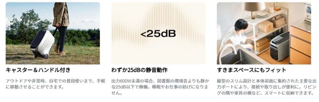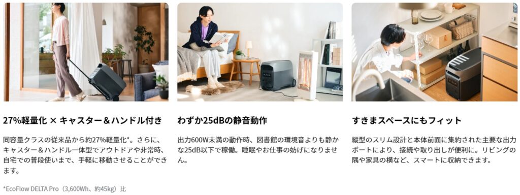 これらは、定格3,000Wの高出力と3,072Whの大容量を備えており、リビングや寝室の電力バックアップを実現します。