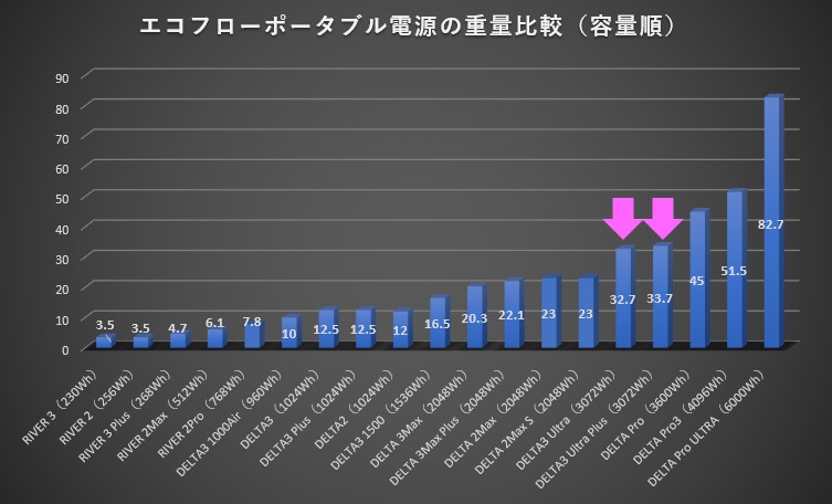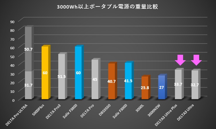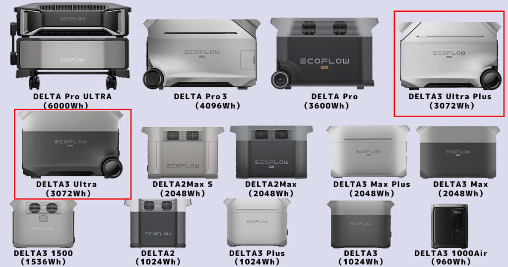 ① EcoFlow DELTA3 UltraとDELTA3 Ultra Plus と容量3000Wh以上ポータブル電源の「サイズ」比較
