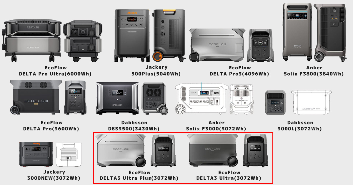 ① EcoFlow DELTA3 UltraとDELTA3 Ultra Plus と容量3000Wh以上ポータブル電源の「サイズ」比較