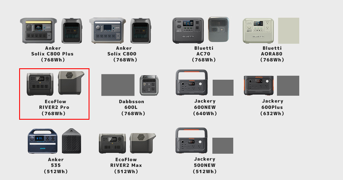 このクラスのポータブル電源は同じ容量の機種が多く、EcoFlow RIVER2 Proと同じ容量768Whが6機種、512Whが3機種あります。