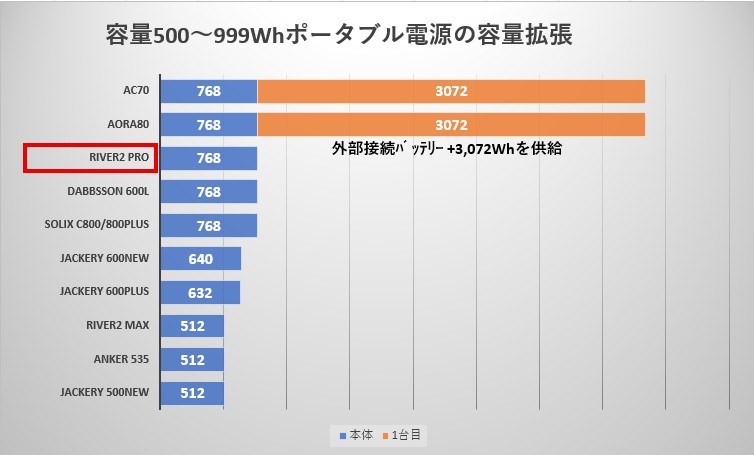 上のグラフは、容量500~999Wh以下のポータブル電源の拡張性を比較したものです。