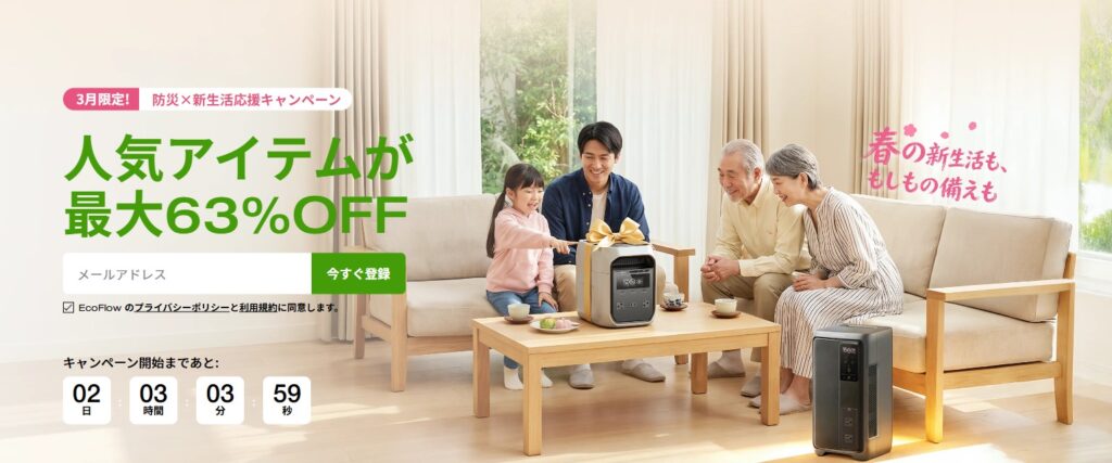 | 3月 | 防災x新生活応援 キャンペーン | 55%OFF | 会員限定72時間フラッシュセール | 40%割引 | 省エネ節電応援キャンペーン | 40%割引 | 春生活応援キャンペーン | 30%割引 |