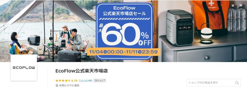 毎月のように開催されている「エコフロー公式オンラインストア」のセールに加え、「公式アマゾン店」、「公式楽天市場店」「公式Yahoo!店」のお買得セール情報も紹介しています。