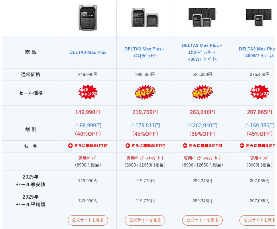 エコフロー公式オンラインストアで販売中の全商品が、機種ごとの一覧で確認できます。今回セールでの割引額を、今年開催されたセールの「最安値」や「平均価格」と比較して確認できます