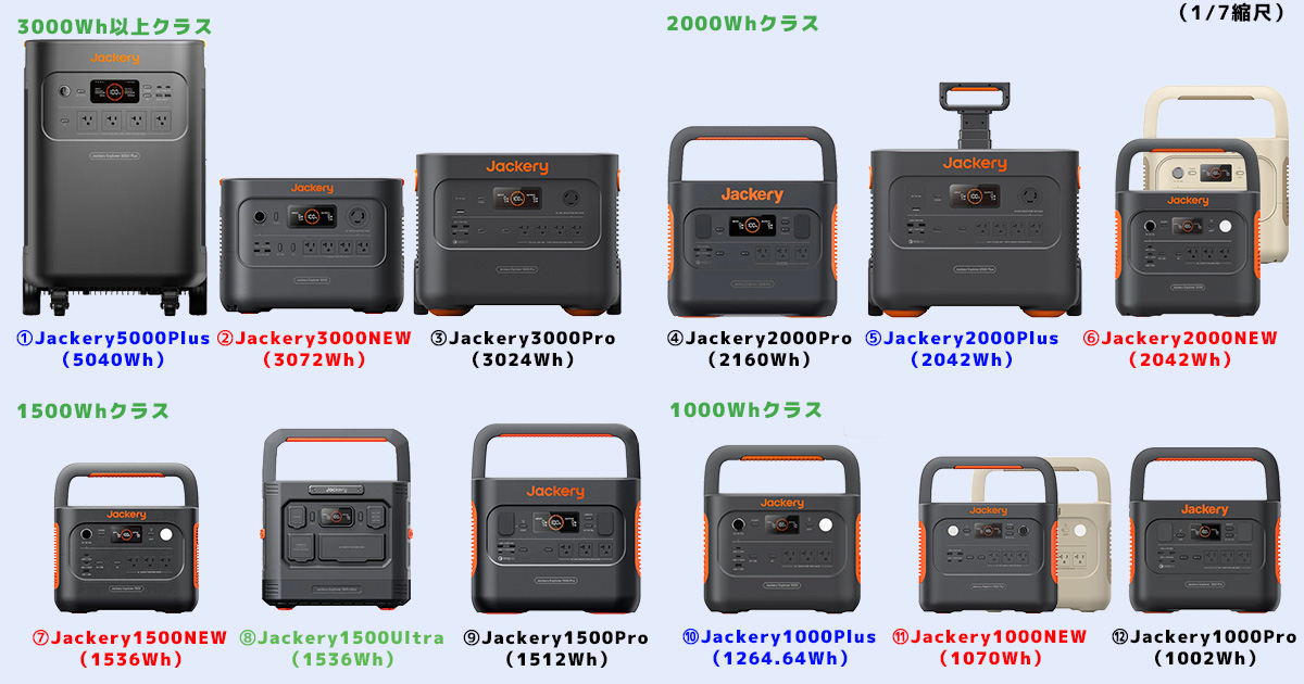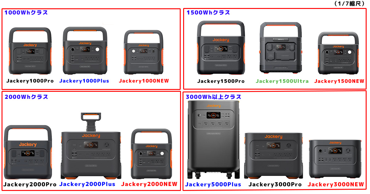 こちらの写真は、ジャクリの大容量(容量1000Wh以上)の機種のサイズを比較したものです。