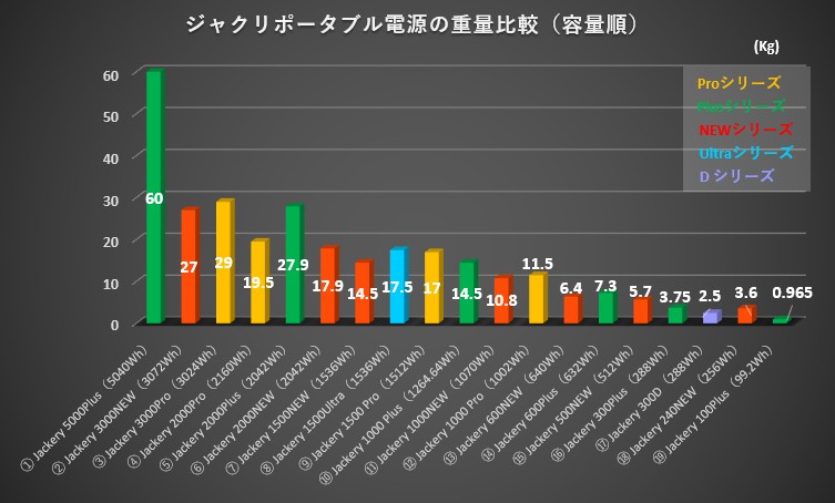 上のグラフは、1000Whクラスのポータブル電源の重量(Kg)を、容量の大きい順に並べて比較したものです。