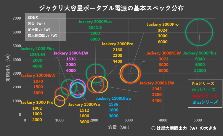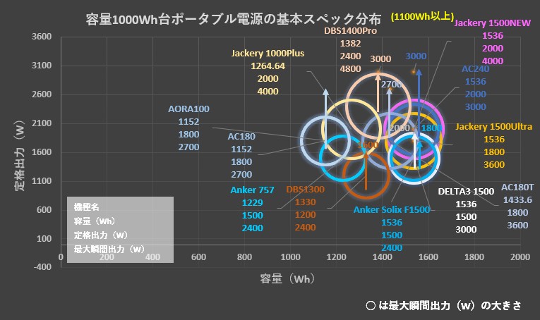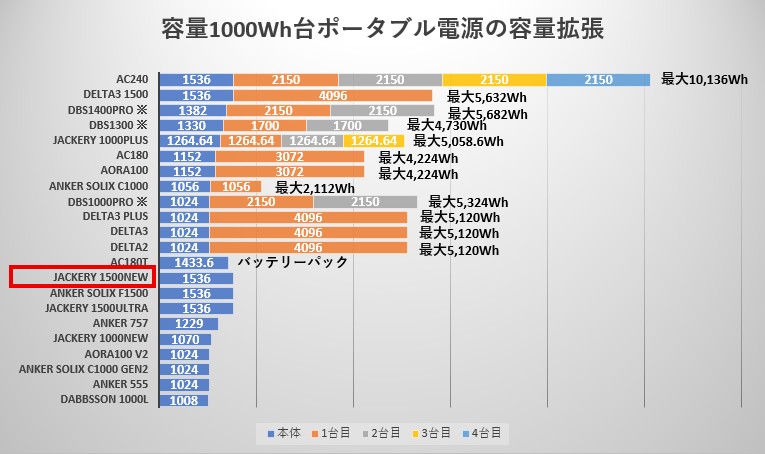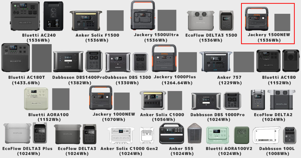 左から5つのポータブル電源は同じ容量(1536Wh)で、Jackery 1500NEWもその中に含まれます。