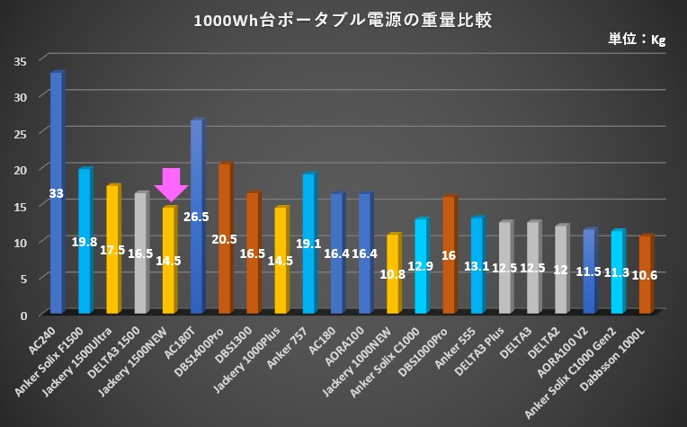 ① Jackery 1500NEWと、容量1000Wh台ポータブル電源の「重量」比較