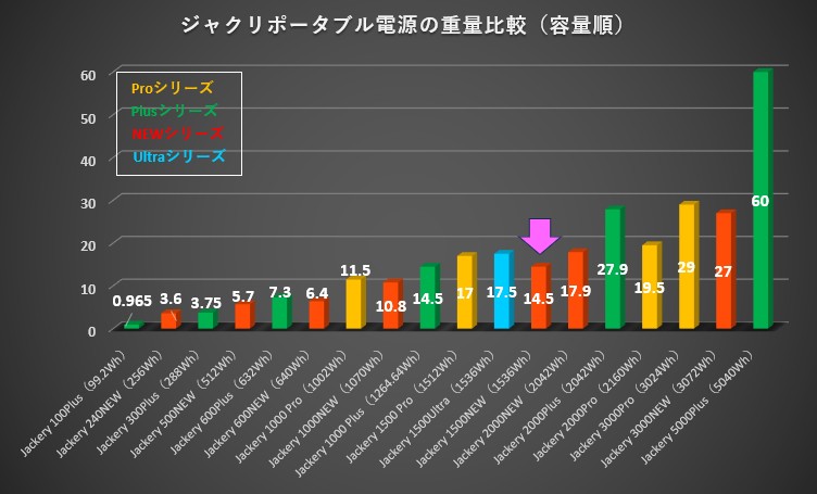 2) Jackery 1500NEWと、他ポータブル電源の「重量」比較