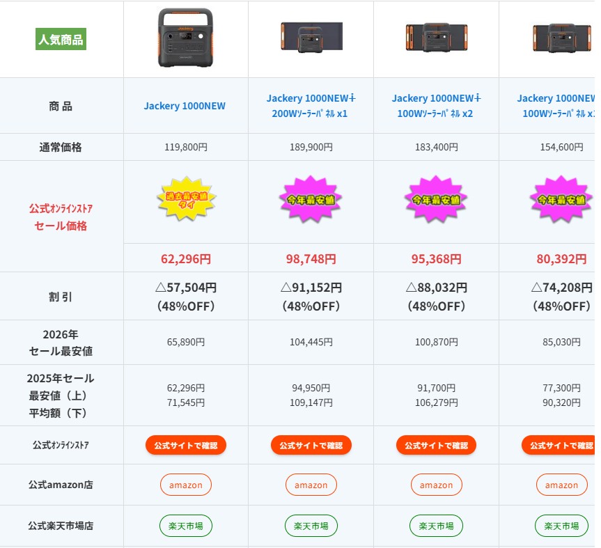 ジャクリポータブル電源16機種の最安値を一覧表で比較できます