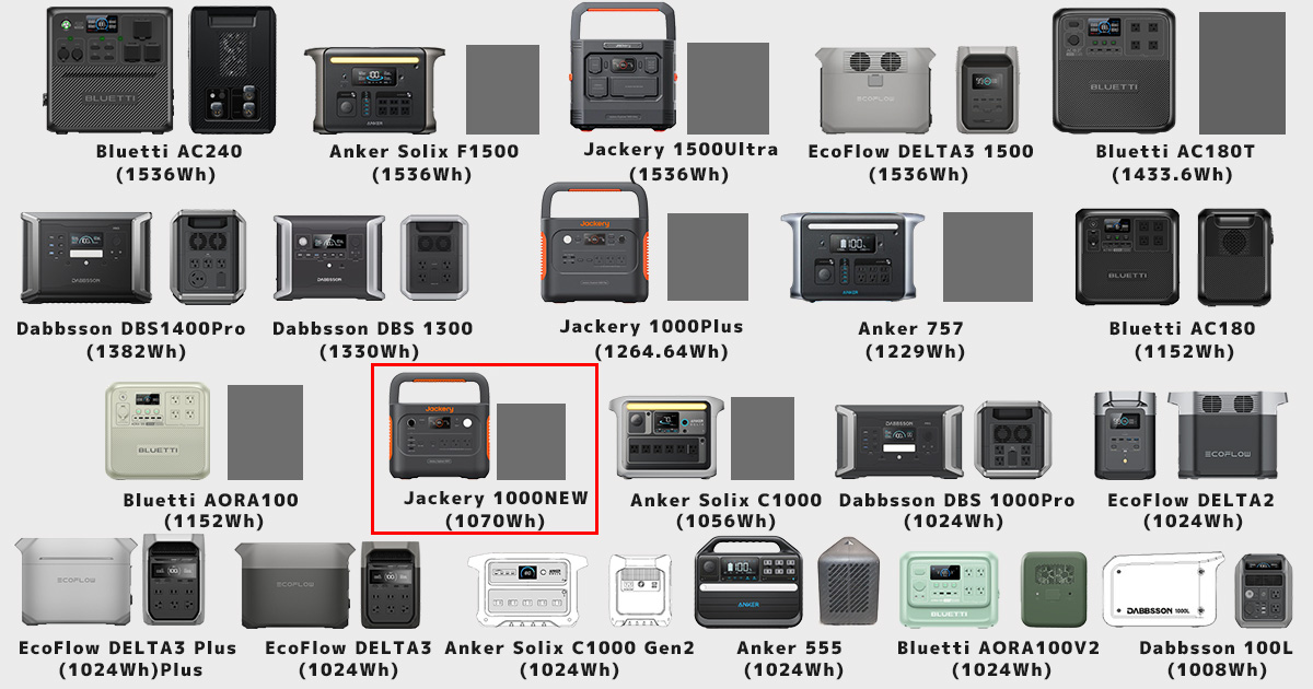 ① Jackery 1000NEWと容量1000Wh台ポータブル電源の「サイズ」比較