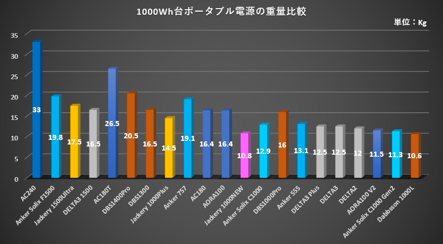 ① Jackery 1000NEWと、容量1000Wh台ポータブル電源の「重量」比較