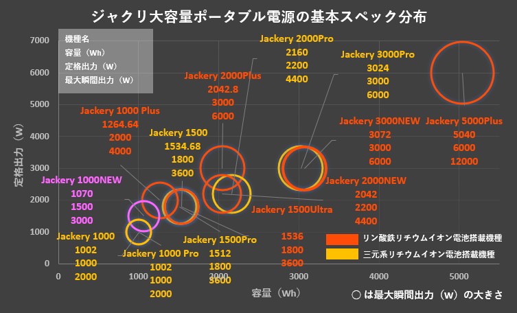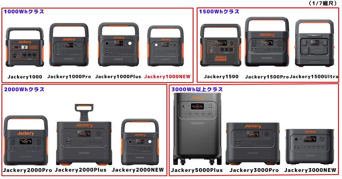 こちらの写真は、ジャクリの大容量(容量1000Wh以上)の機種のサイズを比較したものです。