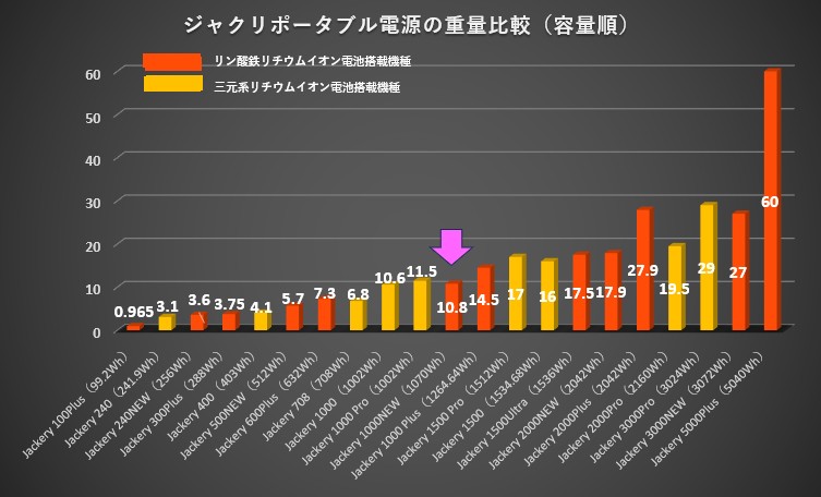 2) Jackery 1000NEWと、他ポータブル電源の「重量」比較