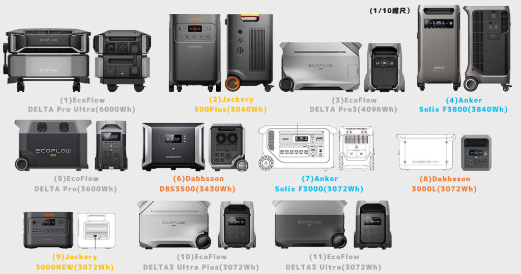 上の写真は、容量3000Wh以上のポータブル電源9機種のサイズ感が一目で分かるよう、1/10縮尺で比較したものです。