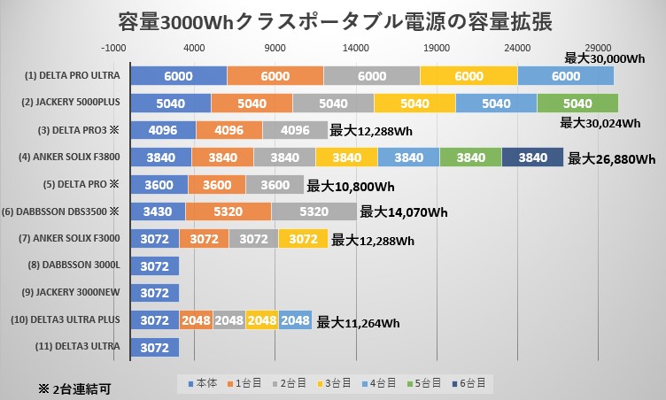上のグラフは、容量3000Wh以上のポータブル電源が持つ拡張性を比較したものです。