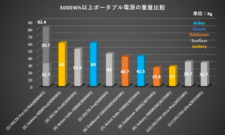 重量60Kgの Jackery 5000Plus(5040Wh)は、グラフ左側の黄色の棒グラフです。