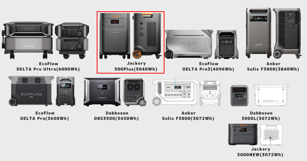 ① Jackery 5000Plusと容量3000Wh以上ポータブル電源の「サイズ」比較
