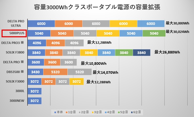上のグラフは、容量3000Wh以上のポータブル電源9機種が持つ拡張性を比較したものです。