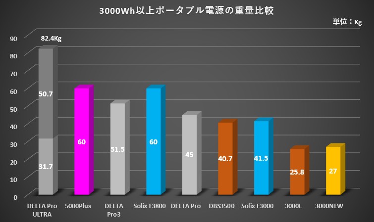 上のグラフは、容量3000Wh以上のポータブル電源9機種の重量(Kg)を、容量の大きい順に並べて比較したものです。