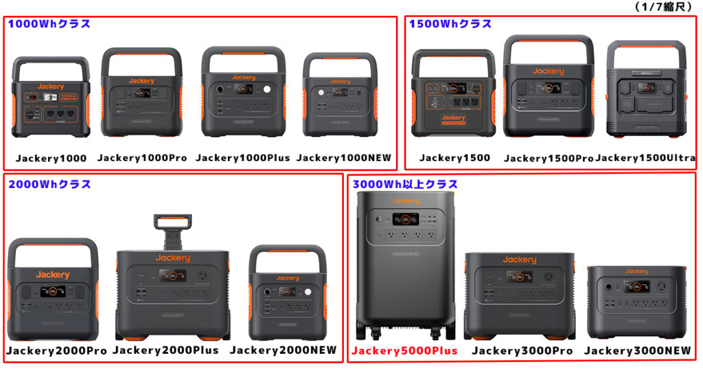 こちらの写真は、ジャクリの大容量(容量1000Wh以上)の機種のサイズを比較したものです。
