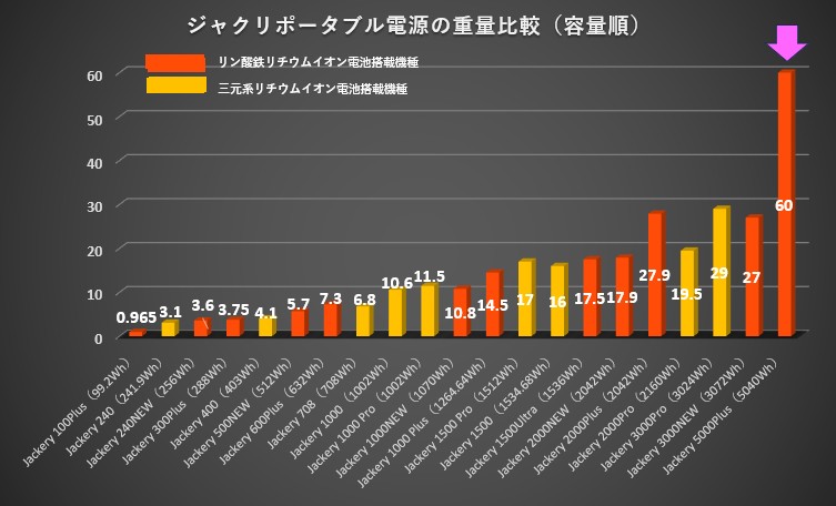 こちらのグラフは、ジャクリのポータブル電源の重量を比較したものです。