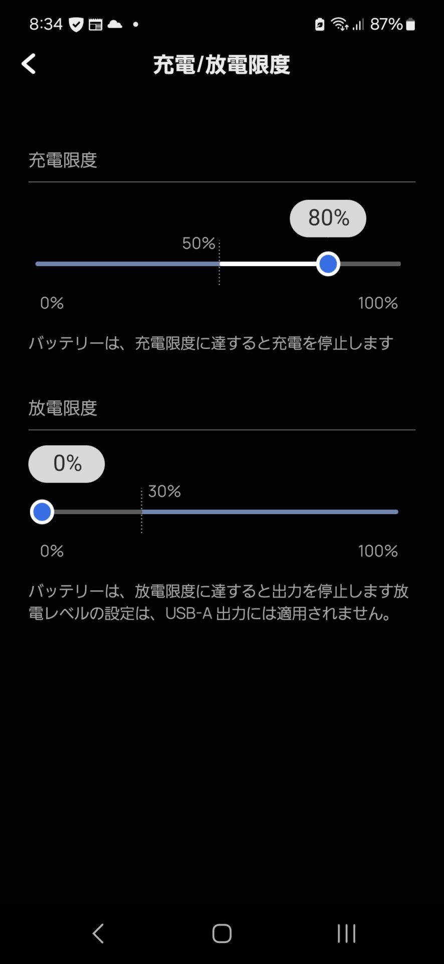 写真にあるように「充電/放電限度」を開くと、充電限度が50%~100%の間で自由に設定できます
