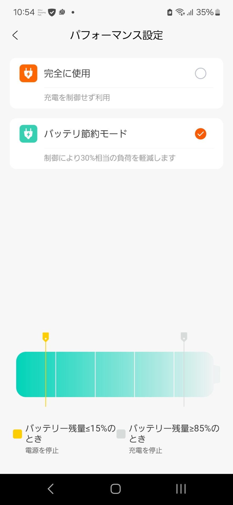 写真にあるように「パフォーマンス設定」で「バッテリー節約モード」を選択すると、充電限度が85%に設定されます