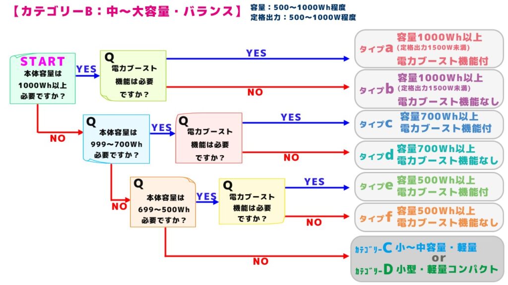 最終的にたどり着いたカテゴリー(A、B、C、またはD)が、今のあなたに最もおすすめのポータブル電源カテゴリーを示しています。