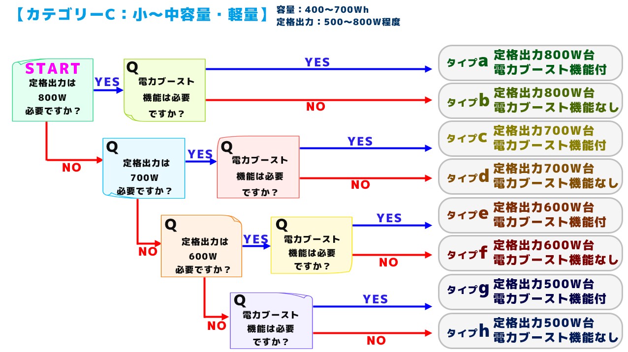 YES/NOチャートを使い、あなたに合った「ポータブル電源タイプ(a,b,c,d…など)」を選びます